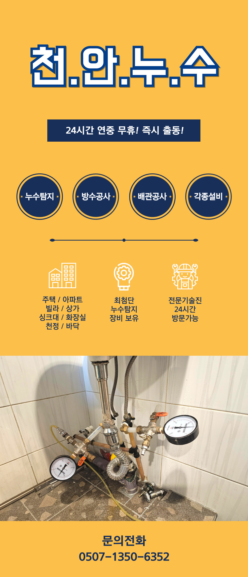 ![]() 갑작스럽게 청구된 수도요금 고지서를 보고 깜짝 놀란 경험, 천안 성거읍 주민이라면 한 번쯤 겪어봤을 법한 일입니다. 특히 평소와 다름없이 물을 사용했는데도 요금이 몇 배로 뛰었다면, 가장 먼저 의심해볼 것은 바로 '누수'입니다. 수도 계량기가 멈춰있는데도 물이 새고 있다면, 보이지 않는 곳에서 물이 낭비되고 있다는 신호이기 때문이죠. 이 문제를 신속하게 해결하지 않으면 재정적 손실뿐만 아니라, 심각한 경우 건물 구조에도 영향을 줄 수 있습니다. 그래서 오늘은 천안누수 성거읍 수도요금 급증 시 누수 의심 체크 순서를 체계적으로 안내해 드리고자 합니다. 이 순서를 차근차근 따라가다 보면, 우리 집의 누수 원인을 정확하게 파악하고 불필요한 지출을 막을 수 있을 것입니다. 천안누수 성거읍 수도요금 급증 시 누수 의심 체크 순서를 숙지하여 당황스러운 상황에 현명하게 대처하는 것이 중요합니다.